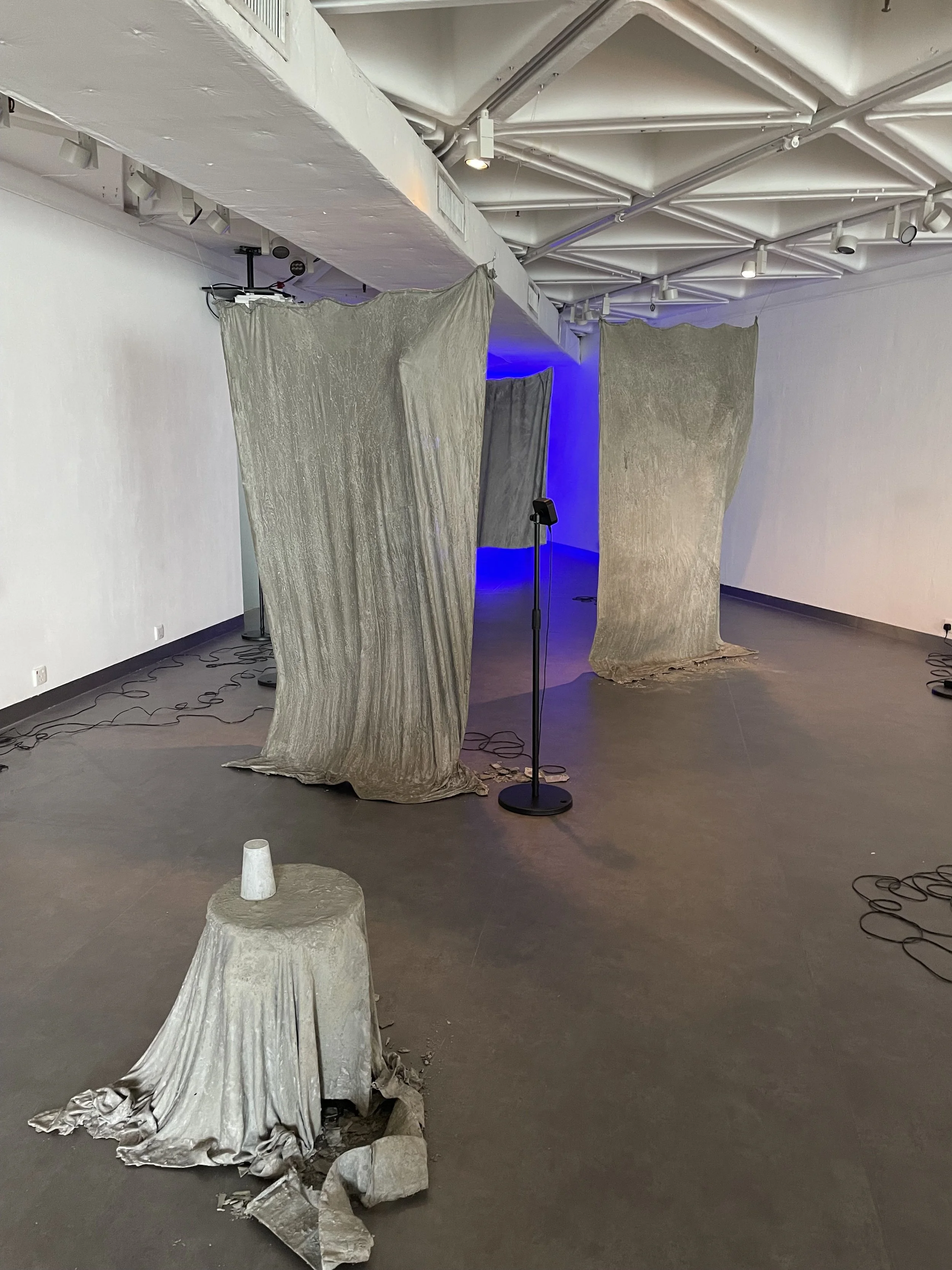 除了來自四位的個人作品外,還有他們共同創作的裝置:幾塊由布料泡水泥漿而成的「布簾」,帶來視覺和觸感上(軟布和硬水泥)的反着;穿梭「布簾」間是雜散的聲音,好像運轉中的機械失靈,失序失衡。特別留意到「布簾」腳不時有破碎之處,有意或無意,都覺得在展現一種「牢不可破但開始崩壞」的狀態,呼應危機的降臨。